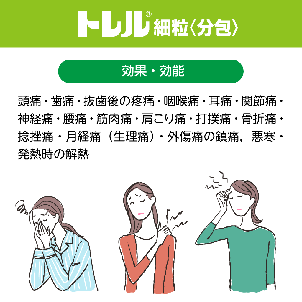頭痛・歯痛・抜歯後の疼痛・咽喉痛・耳痛・関節痛・神経痛・腰痛・筋肉痛・肩こり痛・打撲痛・骨折痛・捻挫痛・月経痛(生理痛)・外傷痛の鎮痛,悪寒・発熱時の解熱